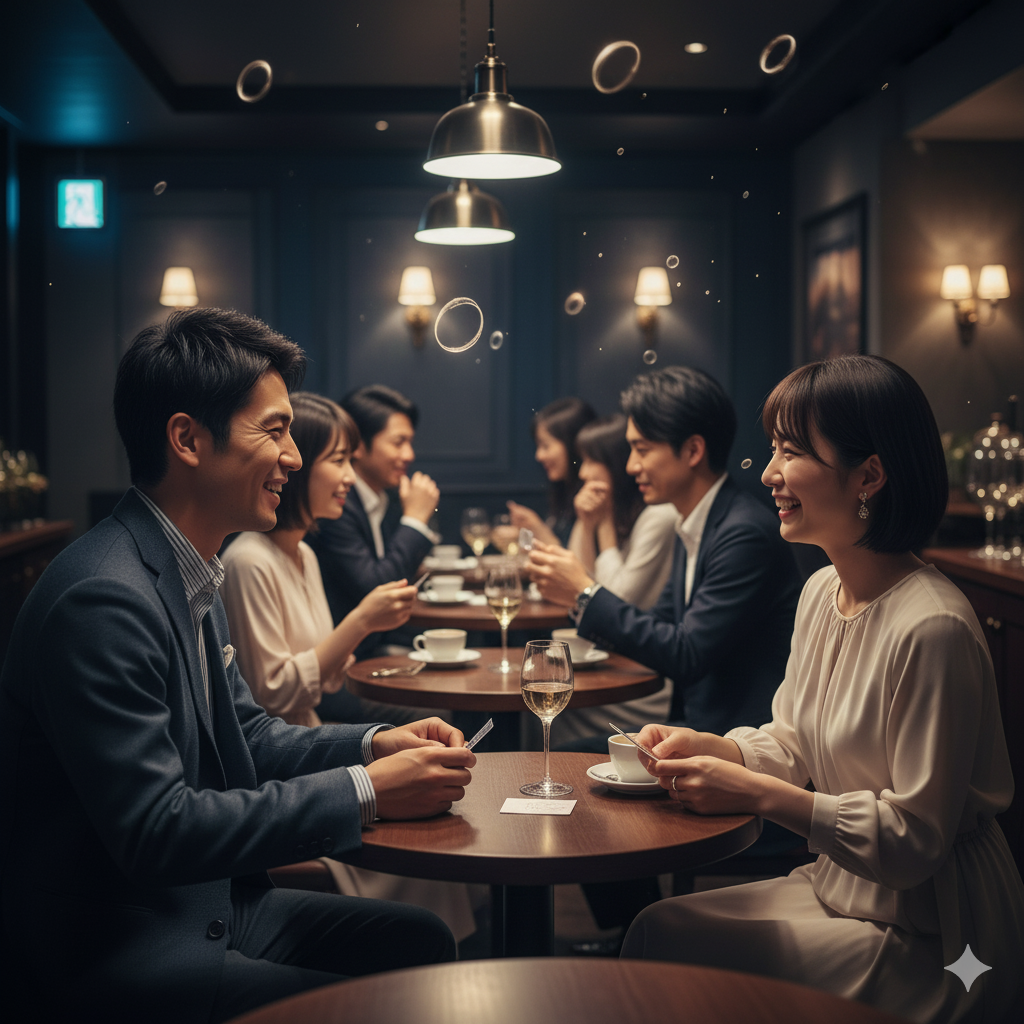 夜の洗練された空間で、未来を真剣に語り合う。安心と信頼の中で、結婚への一歩を踏み出す婚活交流会。